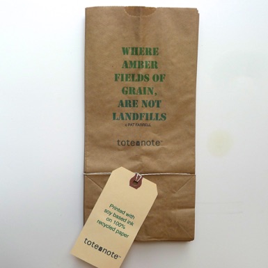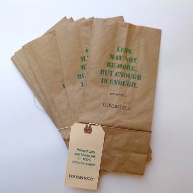 “Quote” tote-notes are printed with soy based ink on 100% recycled paper.